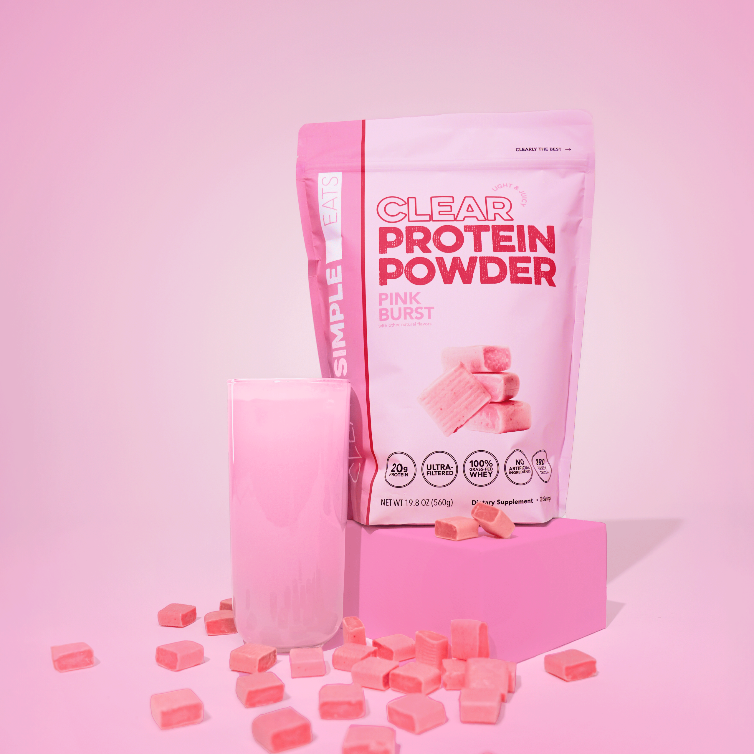FLAVOR PROFILE: Good things come in pink. Fruity sweet and perfectly pink. Pink Burst Clear Protein Powder is even better than candy with 20g of protein in each serving.